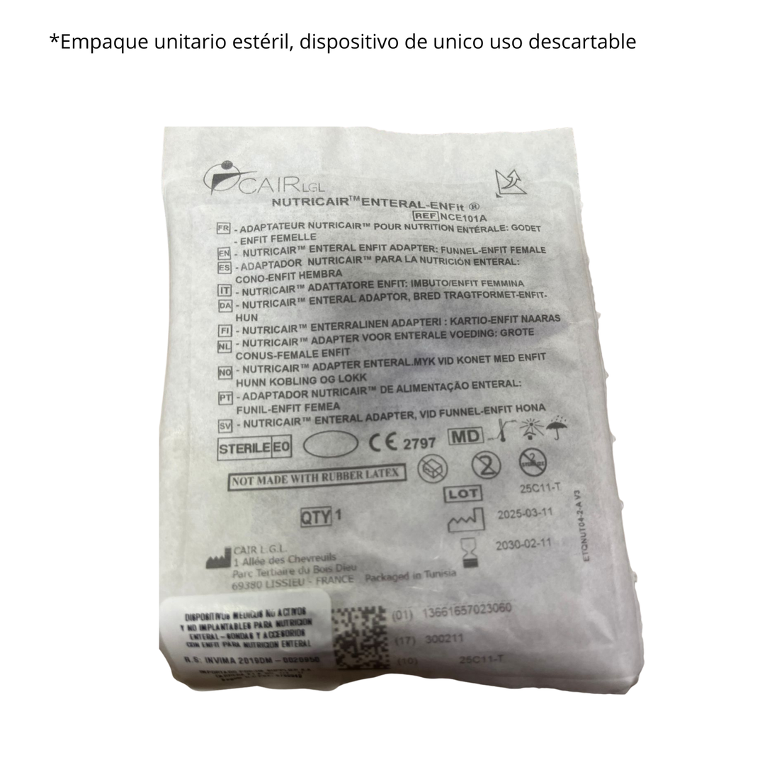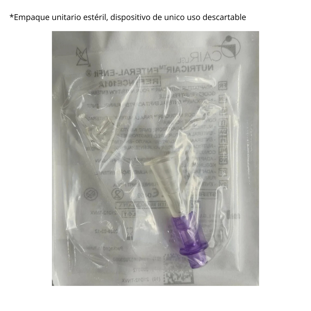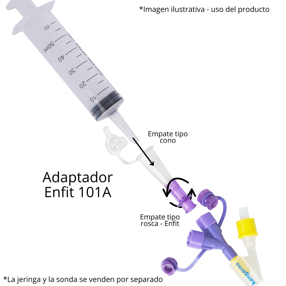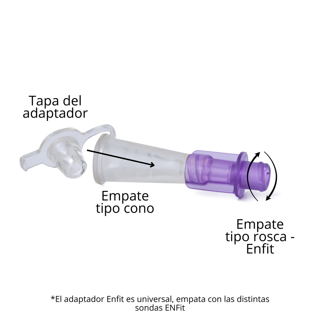 Adaptador conector enteral 101A ENFit Cono - Enfit hembra, dispositivo de transición diseñado con fines exclusivos de nutrición enteral, compatible con todos los dispositivos de tecnología ENFit brindando beneficios tanto para facilitar la labor del clínico, como para resolver al paciente la necesidad de cambio de conectores o conexiones a otros dispositivos ENFit. Este dispositivo cumple con las funciones de: adaptador ENFit, conector ideal para sondas con empate ENFit o extensiones con tecnología ENFit.