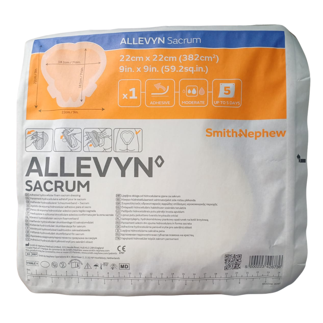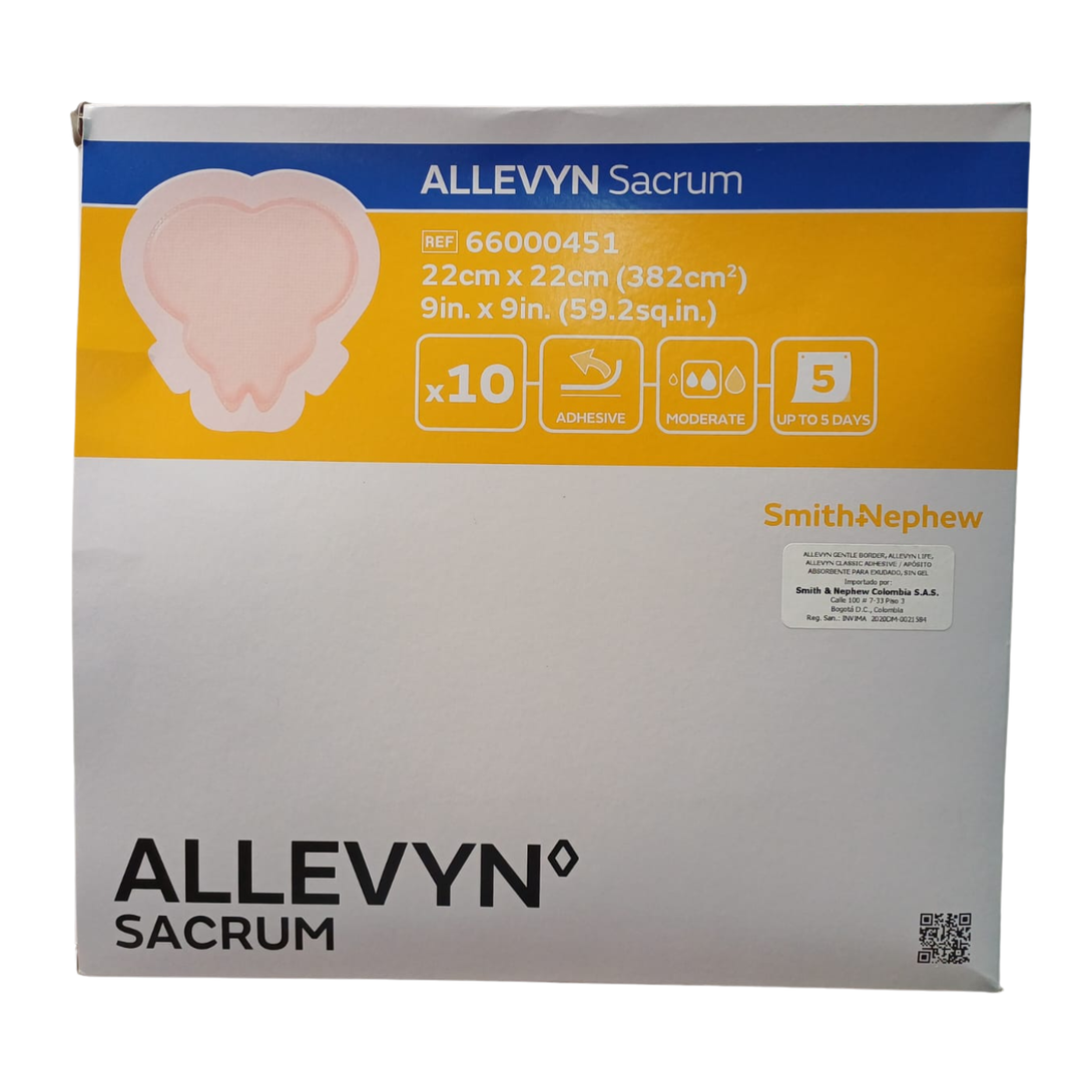 El ALLEVYN Sacrum 22cm x 22cm (Ref 66000451) es un apósito hidrocelular adhesivo de tres capas desarrollado por Smith & Nephew, diseñado específicamente para adaptarse a la anatomía del área sacra.