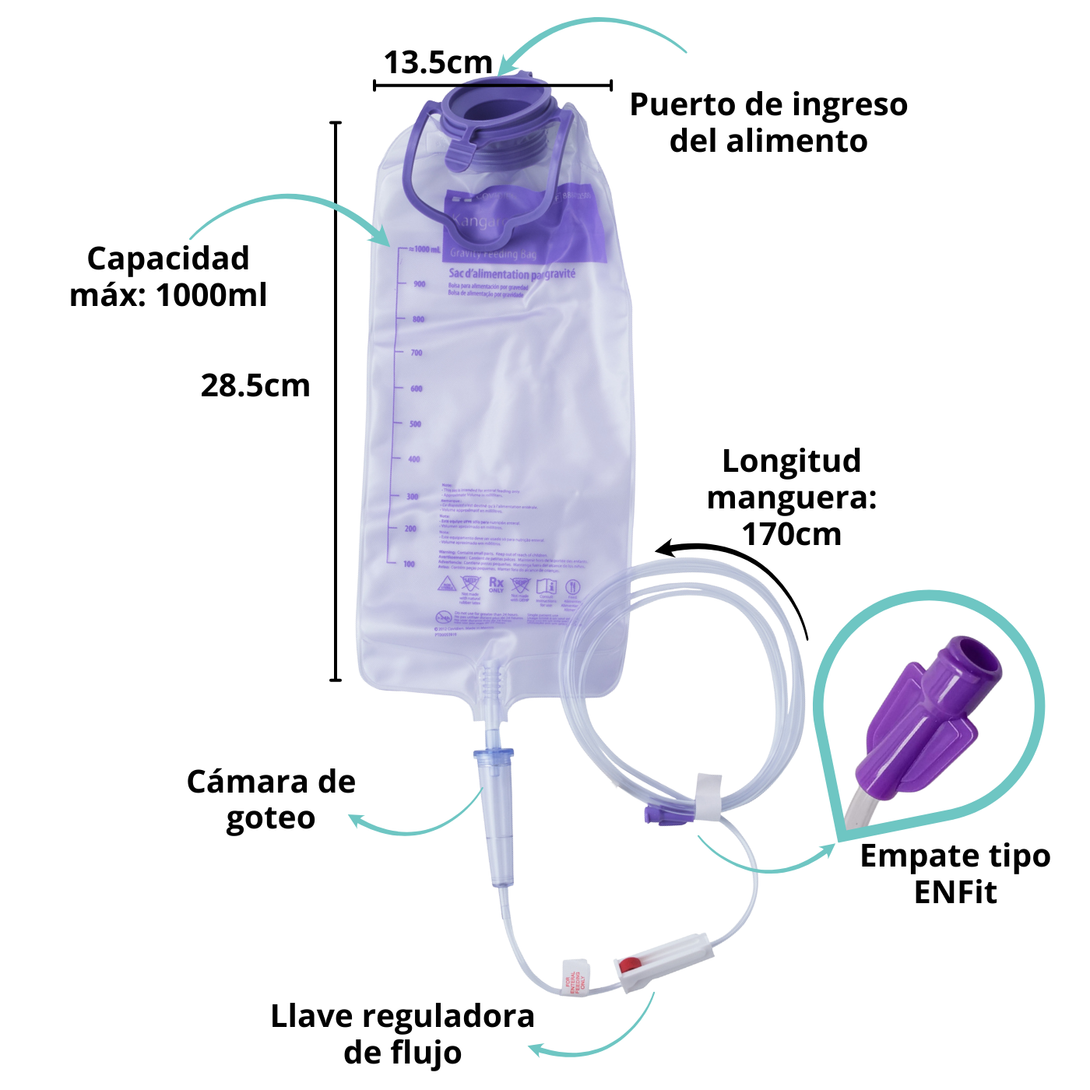 - Regla numérica y transparencia de la bolsa: Permite registro volumétrico de la fórmula a infundir y evaluar la homogeneidad de la fórmula nutricional.