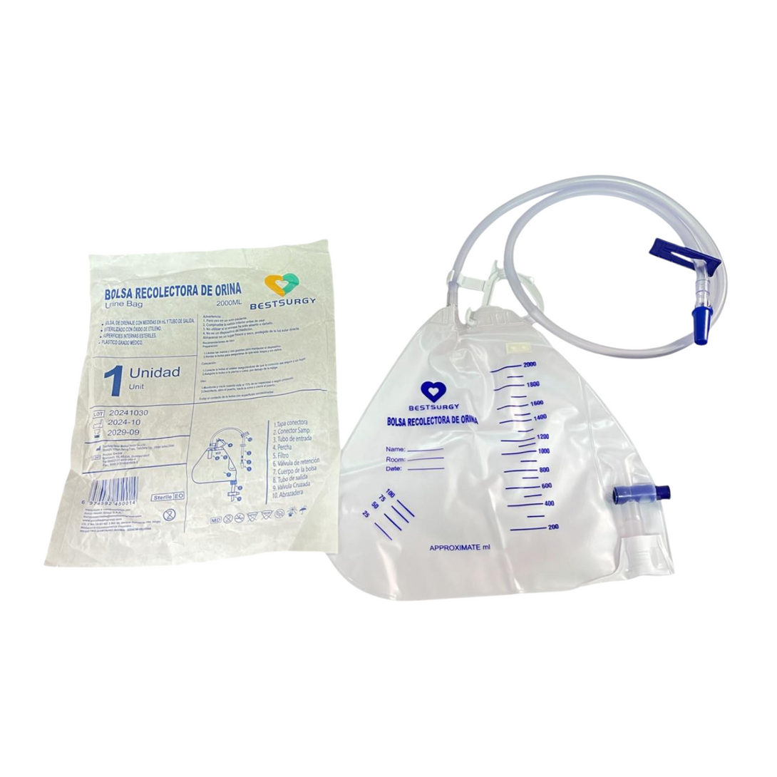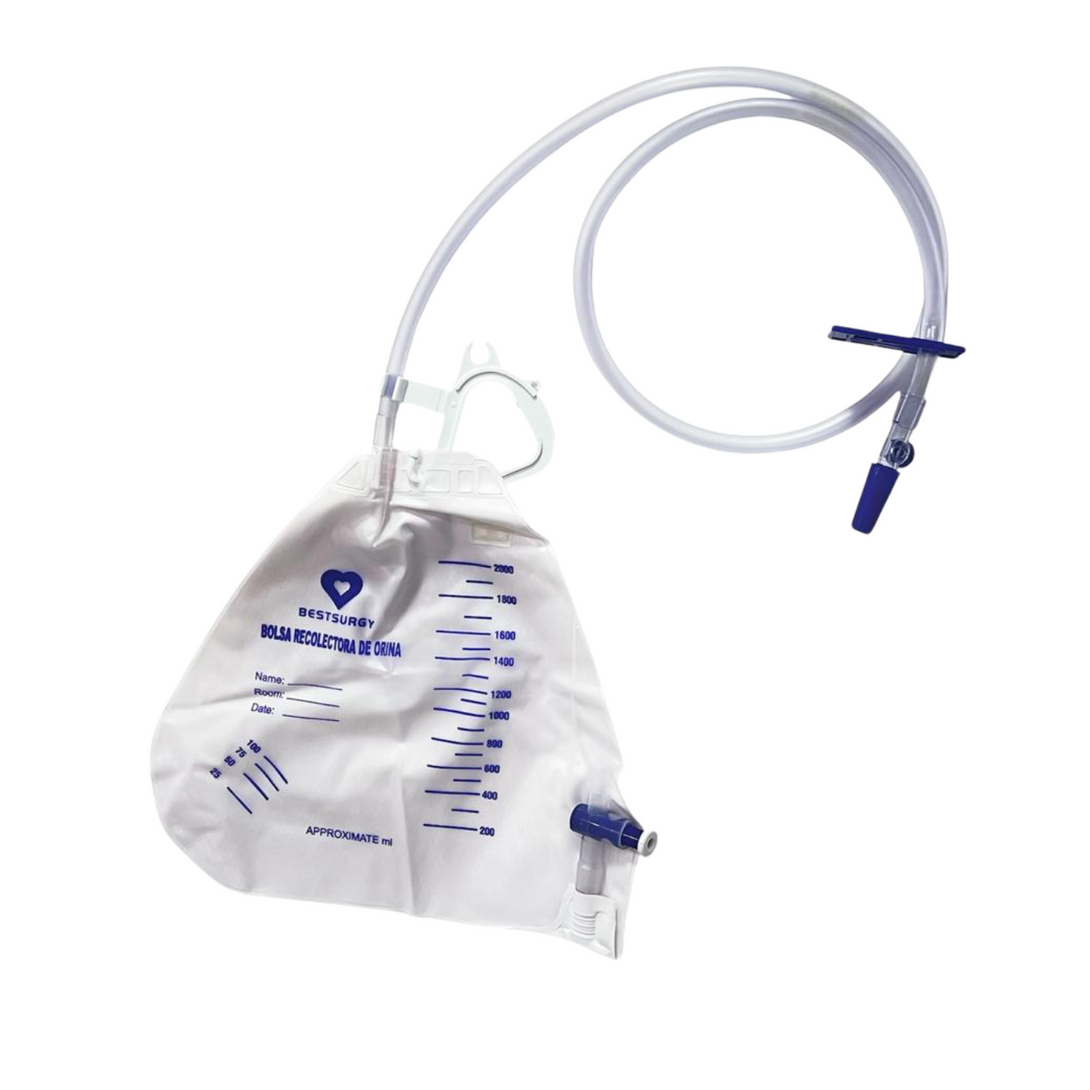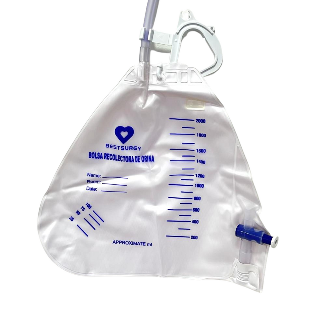 La bolsa recolectora de orina 2000 ml Bestsurgy es un dispositivo médico de un solo uso, diseñado para la recolección segura de orina en pacientes con sonda vesical. Es adecuada para procedimientos hospitalarios, quirúrgicos o cuidado en el hogar. Fabricada en PVC transparente de grado médico, permite una visualización clara del contenido y tiene impresas marcas de volumen para el control de la salida urinaria.