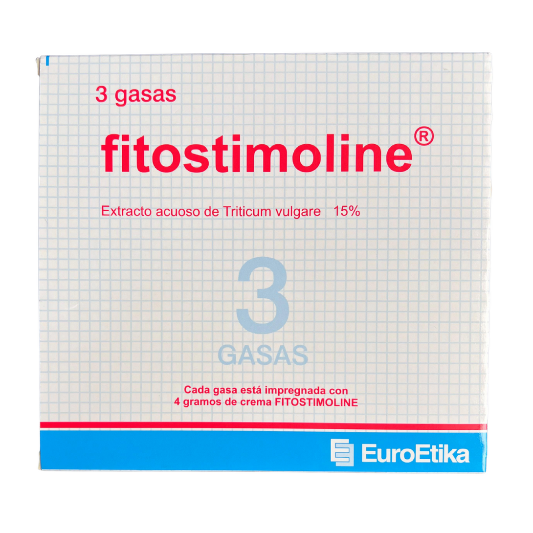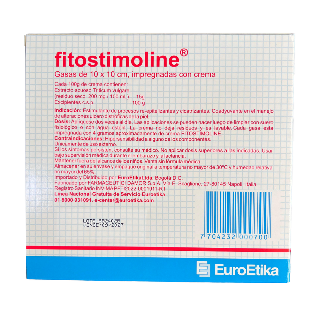 Las gasas Fitostimoline 10x10 cm están impregnadas con aproximadamente 4 g de crema Fitostimoline, formulada con extracto acuoso de Triticum vulgare 15% y excipientes. Están diseñadas para uso externo en procesos de re-epitelización y cicatrización, así como coadyuvante en el manejo de alteraciones ulcerodistróficas de la piel.