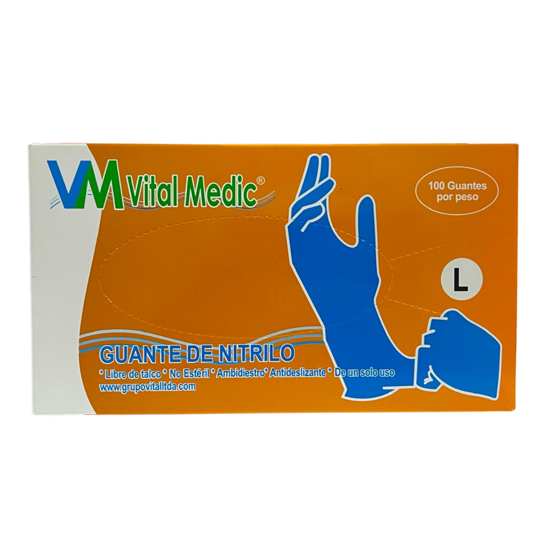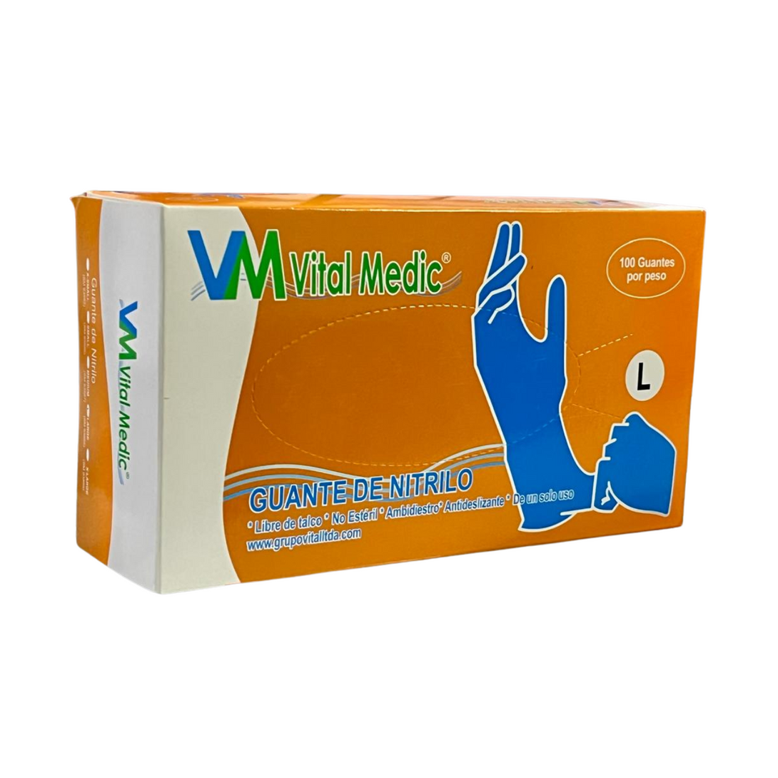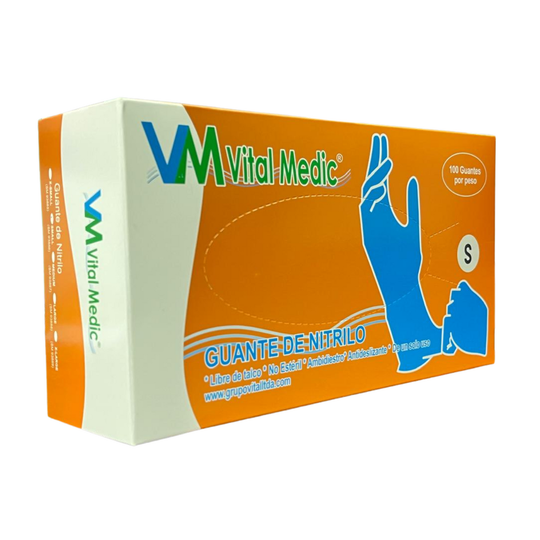 Guantes de nitrilo color azul marca Vital Medic, diseñados para la protección de las manos en procedimientos médicos, odontológicos, farmacéuticos, cosméticos y de laboratorio. Su composición libre de látex los hace adecuados para personas con alergias. Ofrecen ajuste anatómico, superficie microtexturizada para mejorar la sujeción y son aptos para ambas manos.