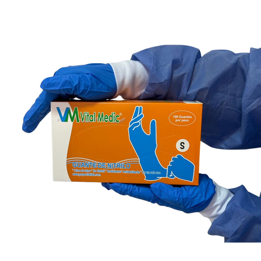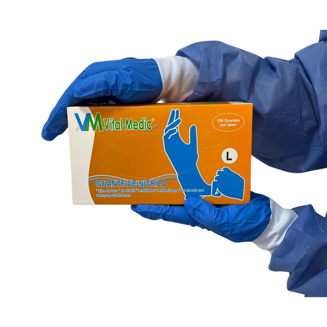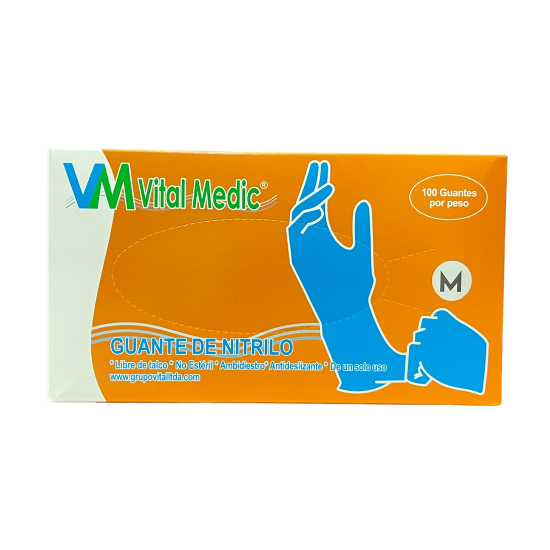 Guantes de nitrilo color azul marca Vital Medic, diseñados para la protección de las manos en procedimientos médicos, odontológicos, farmacéuticos, cosméticos y de laboratorio. Su composición libre de látex los hace adecuados para personas con alergias. Ofrecen ajuste anatómico, superficie microtexturizada para mejorar la sujeción y son aptos para ambas manos.