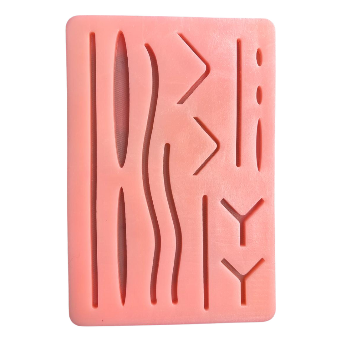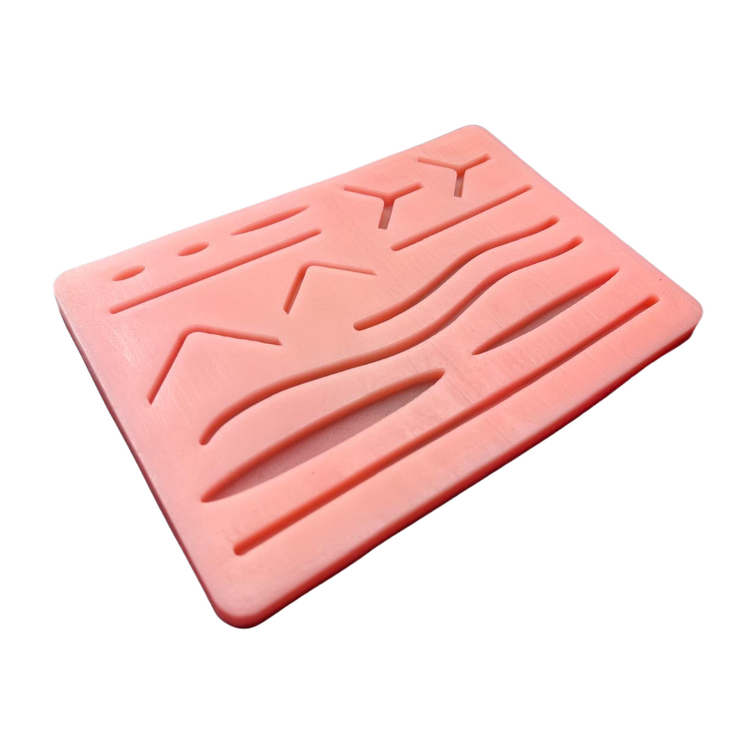 Dispositivo didáctico destinado a la enseñanza y práctica de técnicas de sutura quirúrgica. Diseñado con tres capas que simulan la estructura anatómica de la piel: epidermis, tejido subcutáneo y músculo, permitiendo una experiencia de entrenamiento realista.
