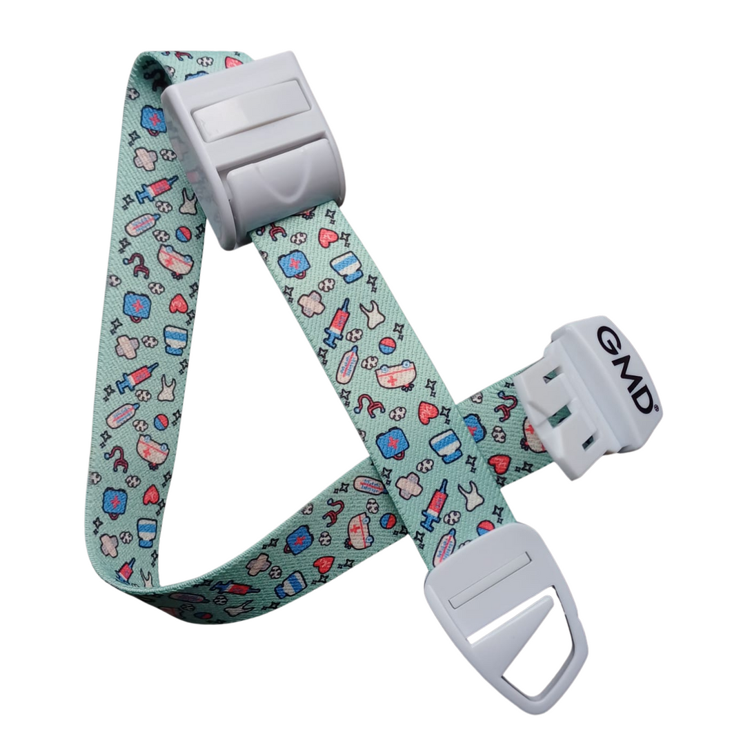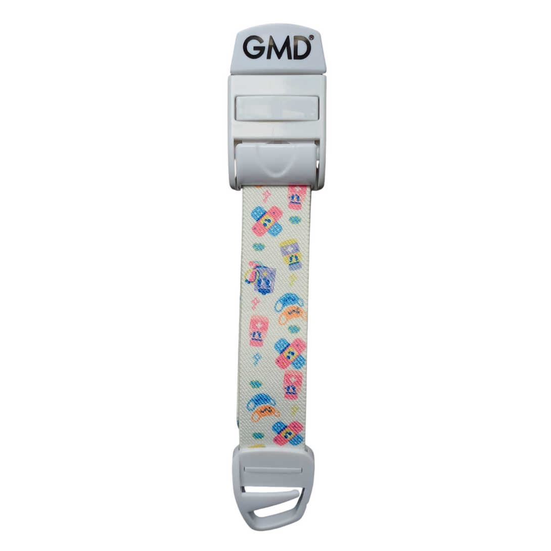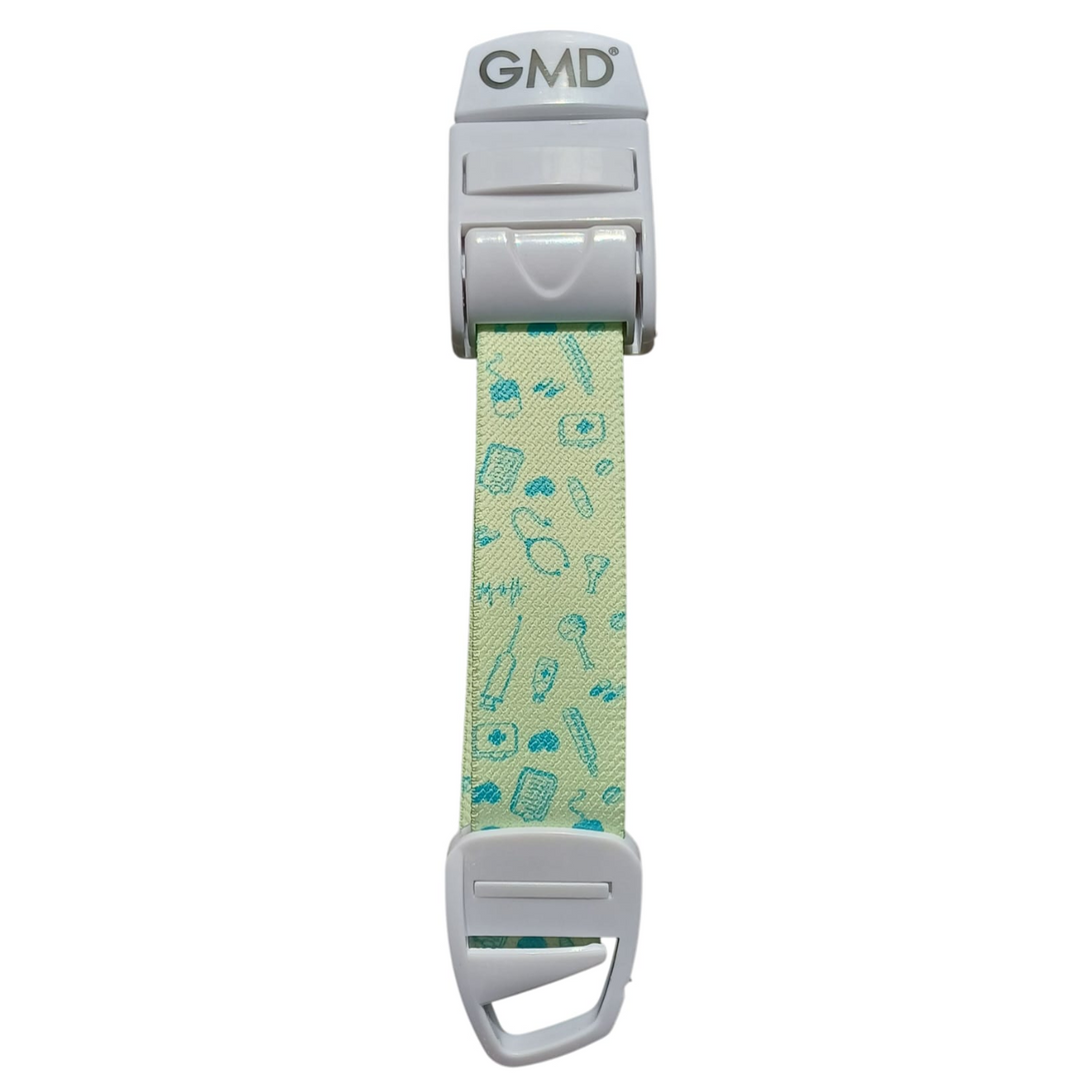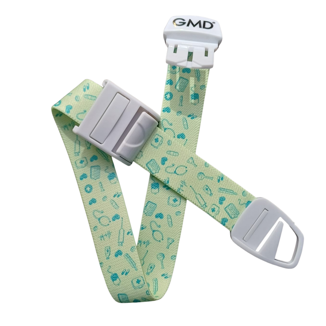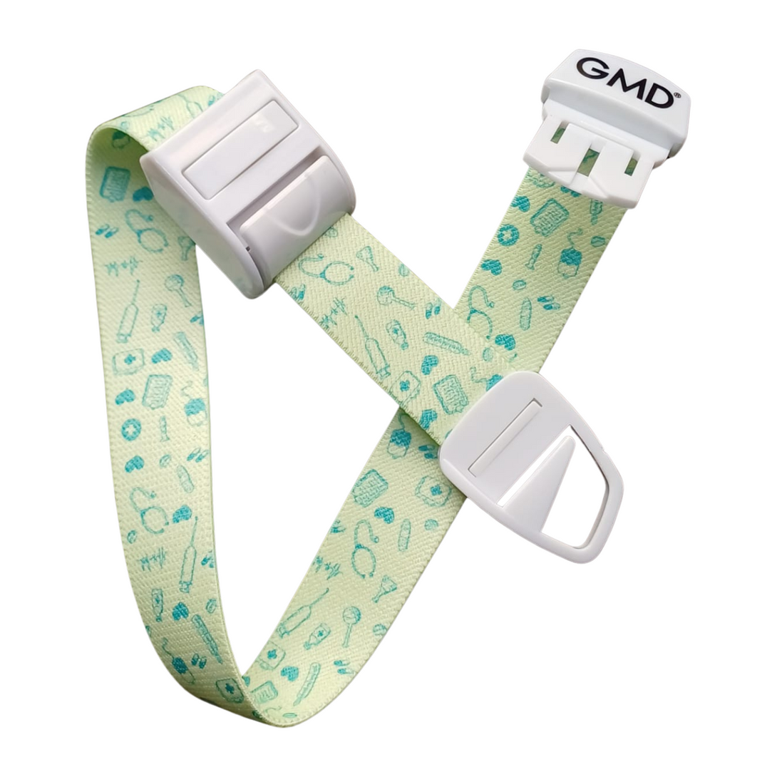 El Torniquete GMD Motivo Caritas Médicas es un dispositivo médico usado para compresión temporal de vasos sanguíneos durante procedimientos como la toma de muestras de sangre o canalizaciones venosas. Está diseñado para aplicarse con una sola mano y ajustarse al paciente de forma segura.
