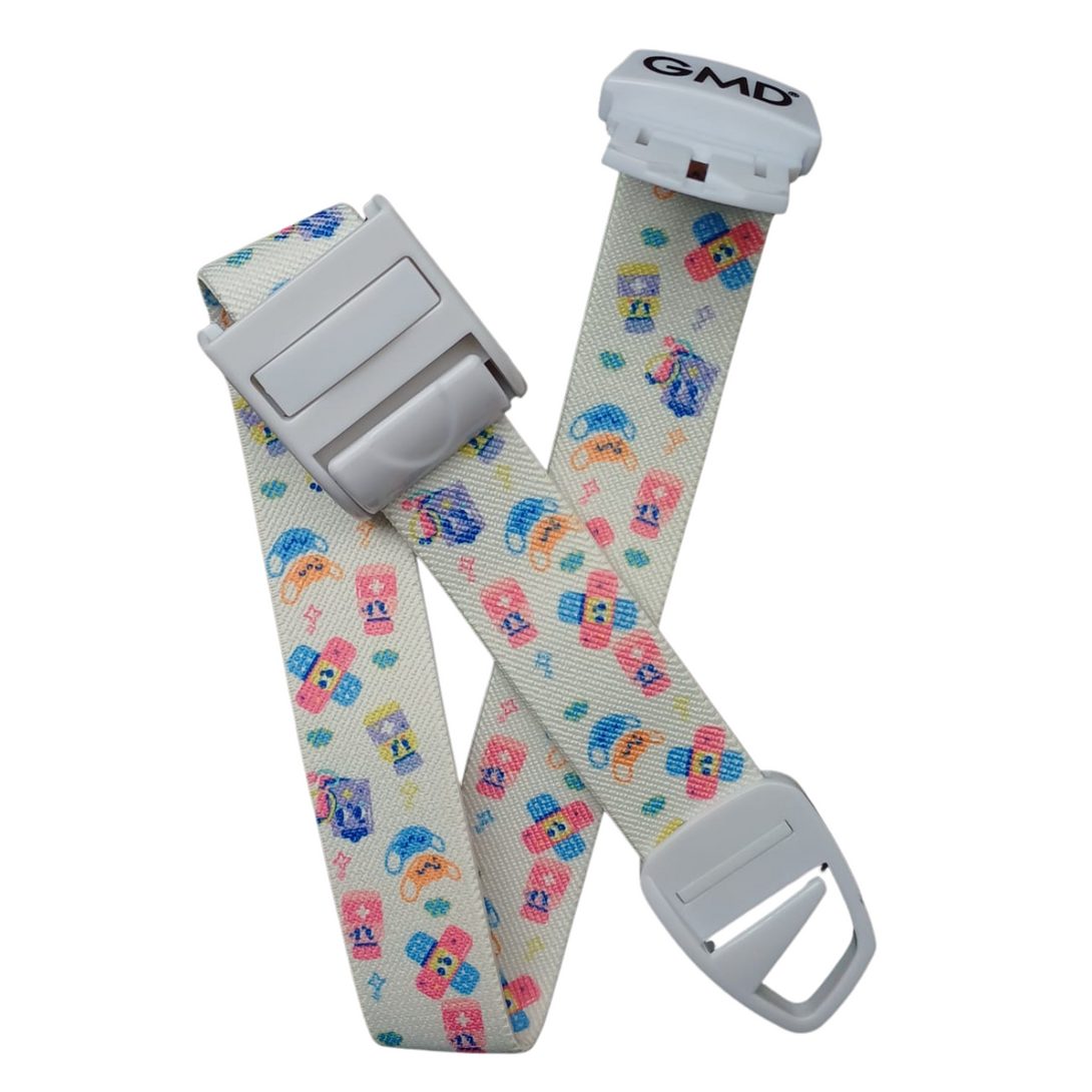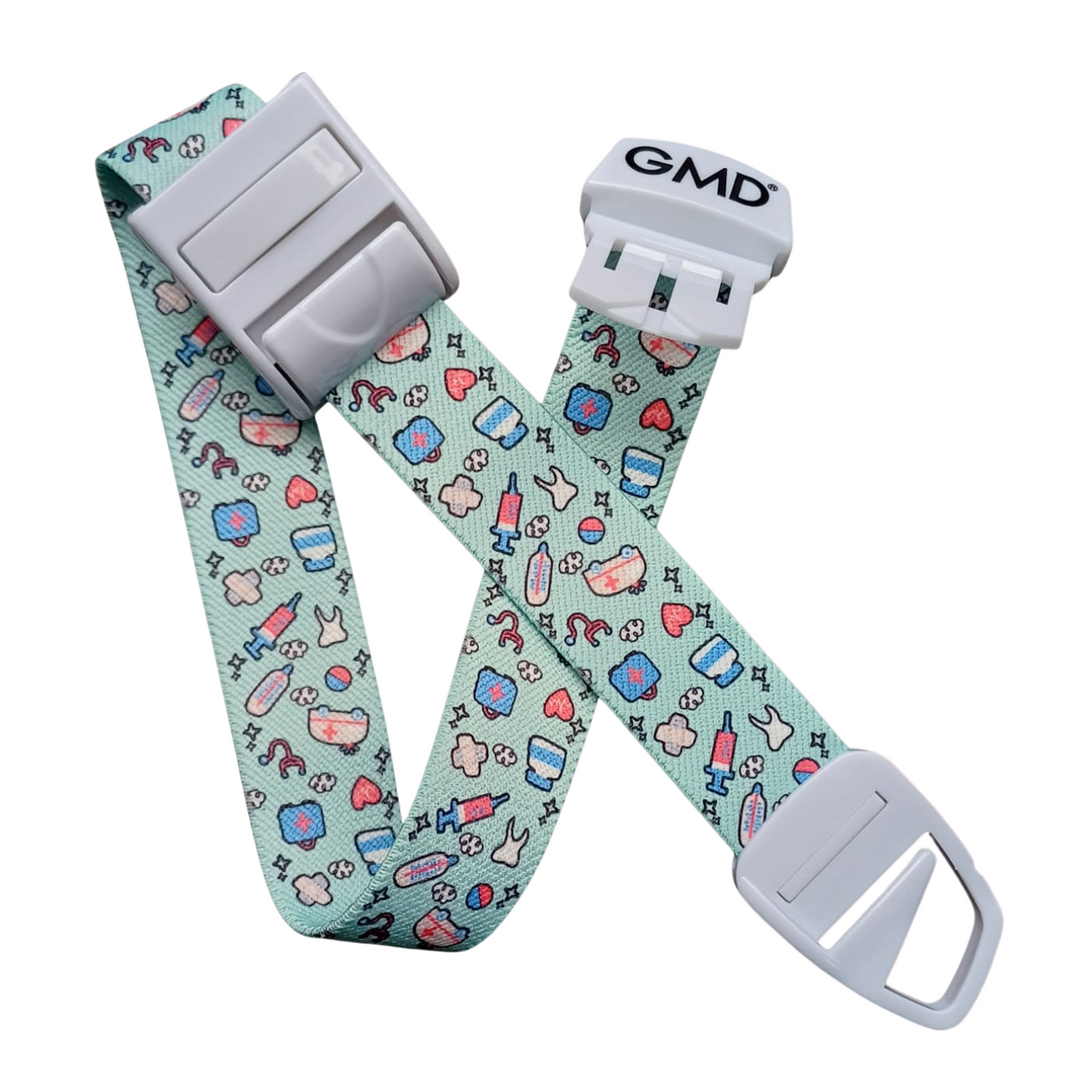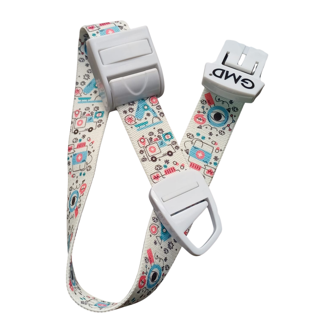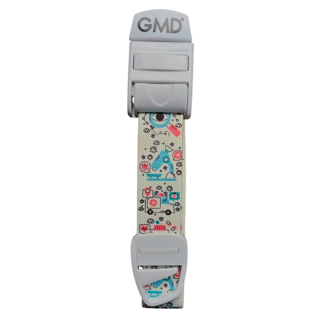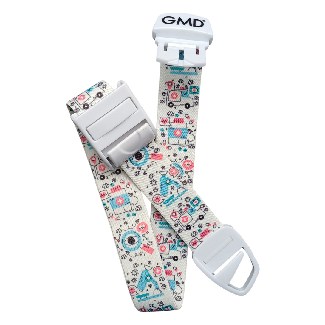 El Torniquete GMD Motivo Caritas Médicas es un dispositivo médico usado para compresión temporal de vasos sanguíneos durante procedimientos como la toma de muestras de sangre o canalizaciones venosas. Está diseñado para aplicarse con una sola mano y ajustarse al paciente de forma segura.